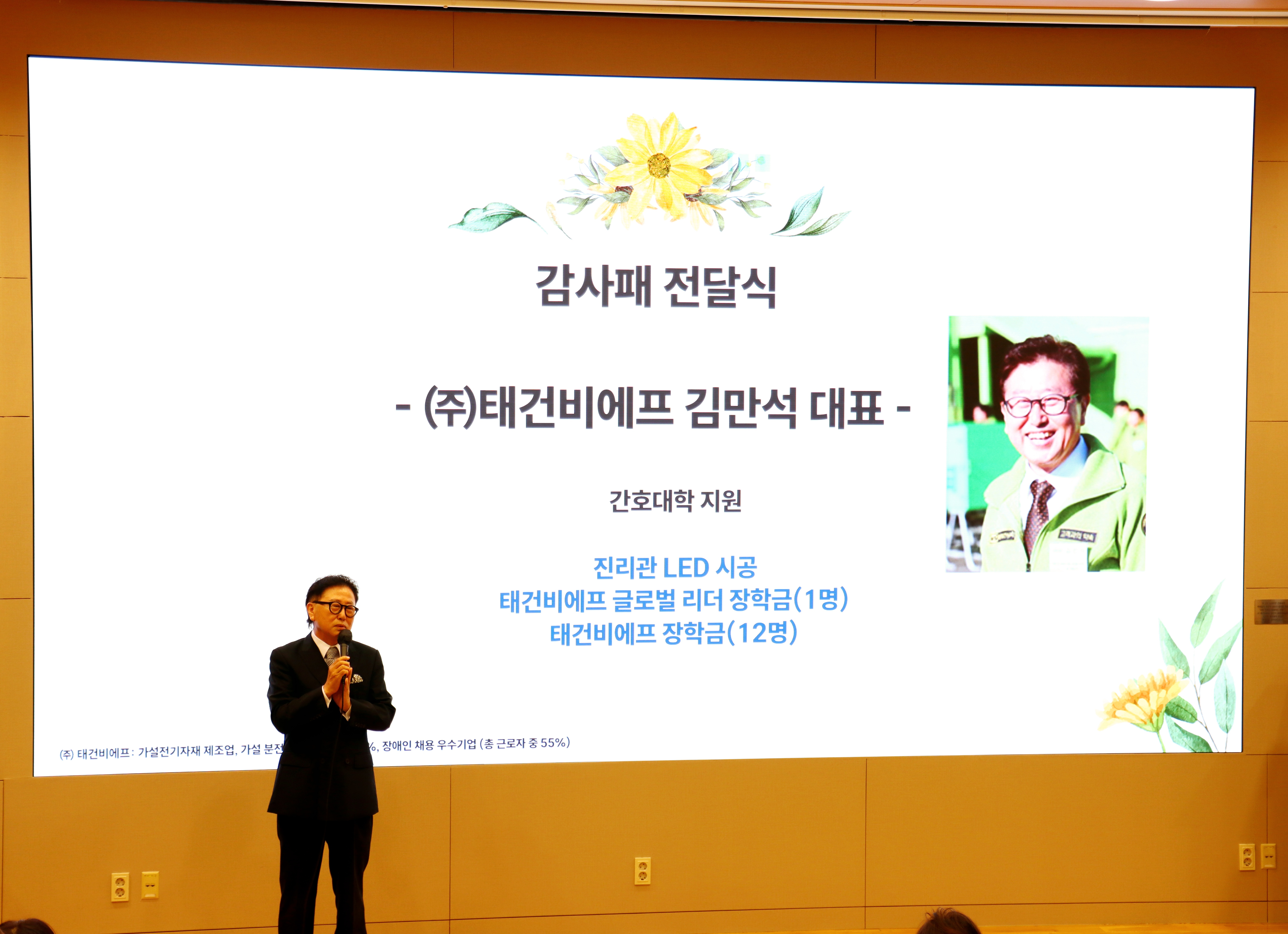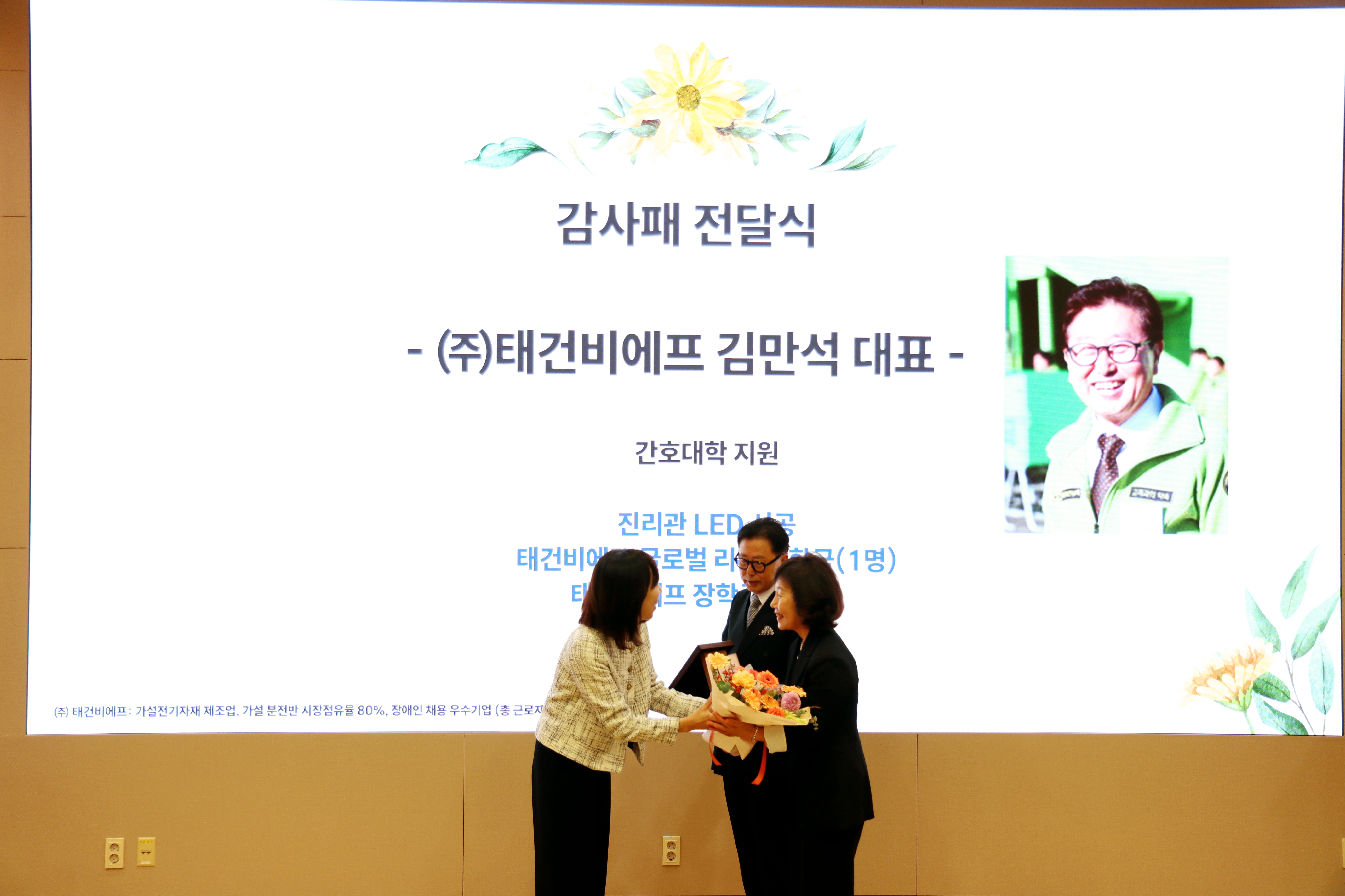 연세대학교 간호대학은 2025년 10월 13일(월), 교직원 예배 시간에 (주)태건비에프 김만석 대표에게 감사패를 전달하며, 그동안 간호대학을 위한 소중한 나눔에 깊은 감사를 전했다.
