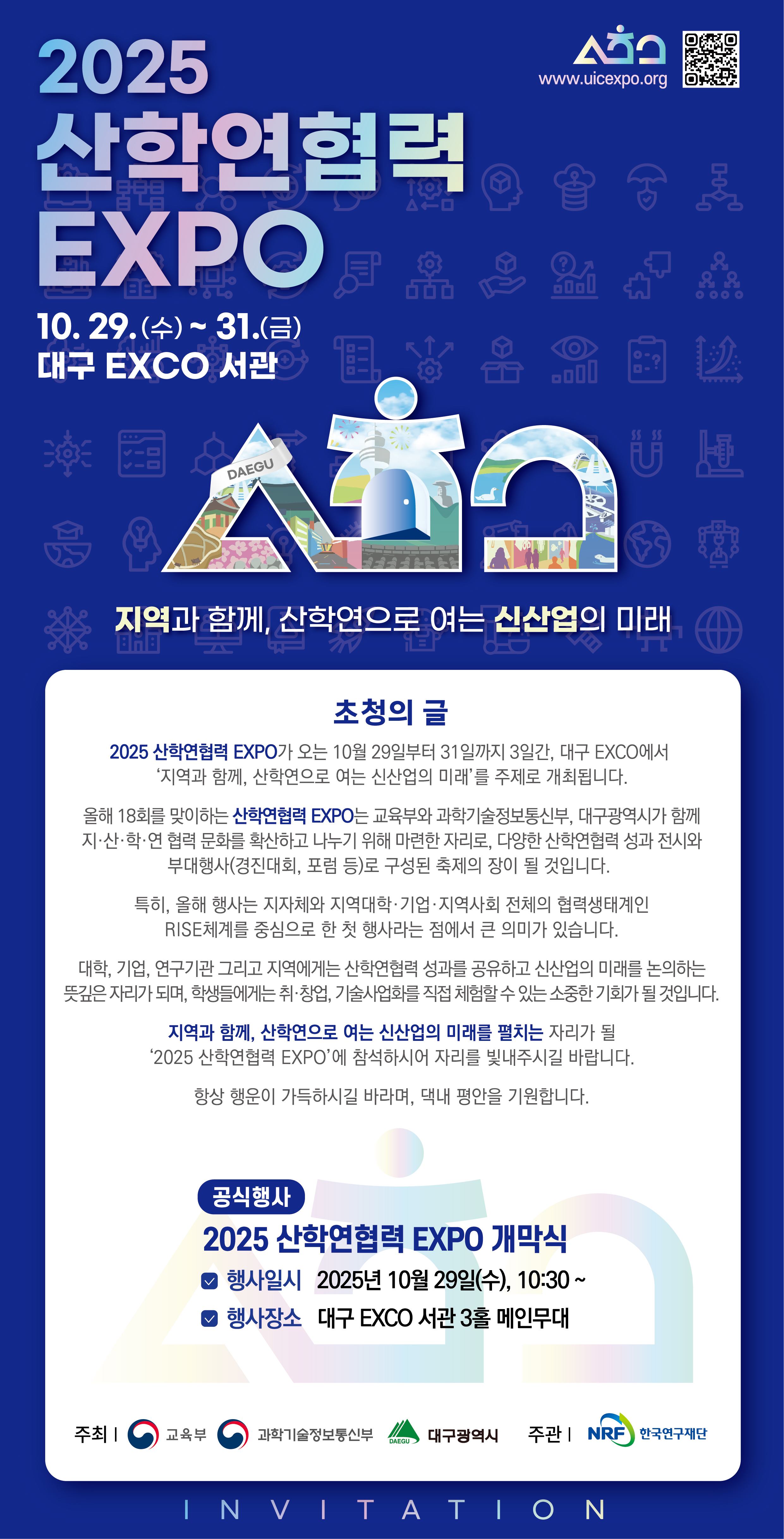 사업공고 [한국연구재단] 2025 산학연협력 EXPO 개최 안내 관리자 2025-10-27 조회수 76 붙임3. 2025 산학연협력 EXPO 초청장.jpg 붙임3. 2025 산학연협력 EXPO 초청장(외3).zip 2025 산학연협력 EXPO 개최 안내 목록 이전글[과기정통부 보도자료(25.10.26)] R&D 혁신을 위한 연구현장 간담회 개최 다음글다음글이 없습니다.